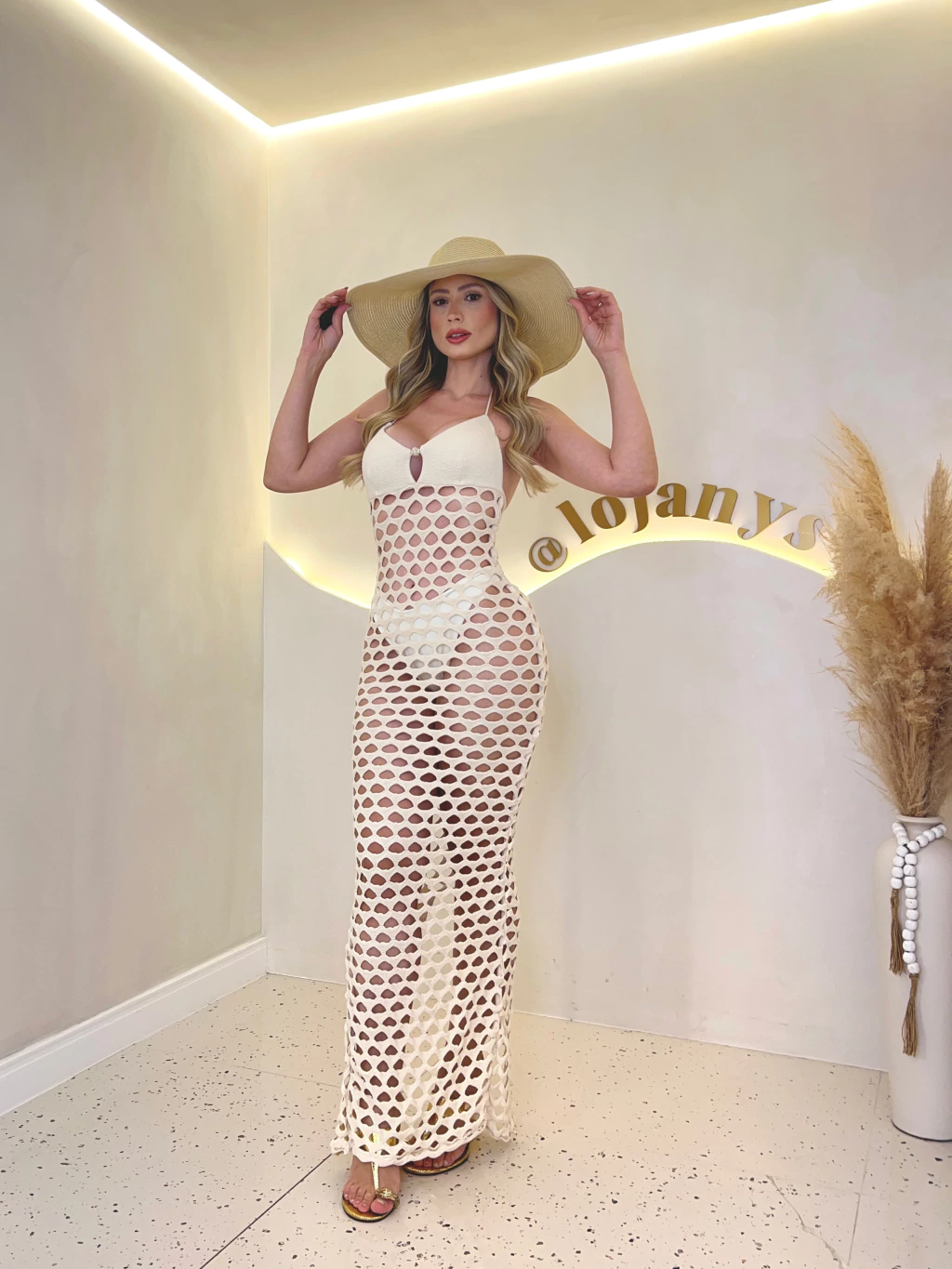 O Dress Ariel é um vestido estilo saída, elegante e artesanal, confeccionado em tecido que lembra tricô, com trama aberta que proporciona leveza e caimento natural. Possui modelagem mais curta atrás, criando movimento, e um estilo fluido e delicado, ideal para produções casuais ou eventos diurnos. Acompanha calcinha de biquíni confeccionado em tecido (não indicado para banho)